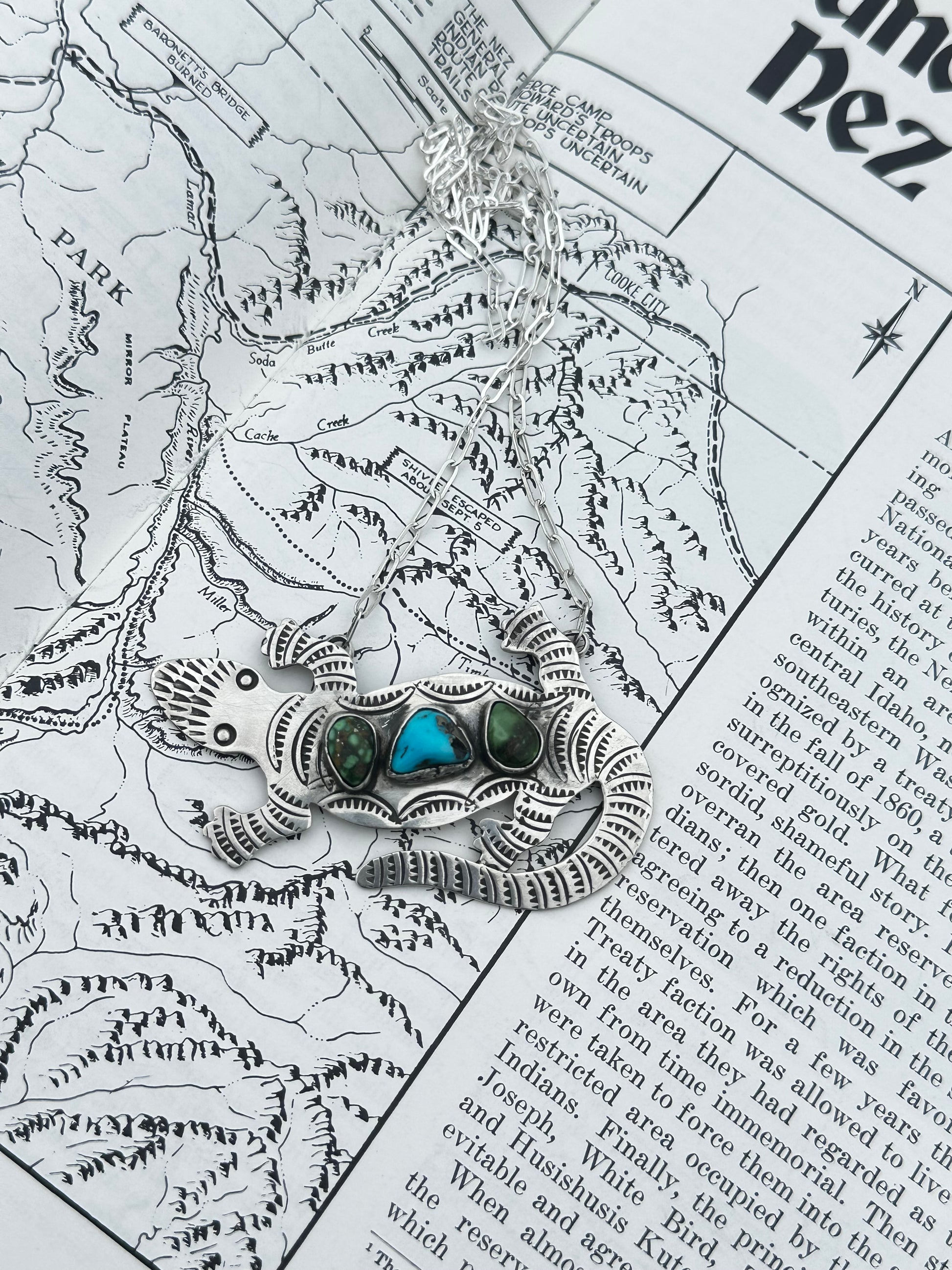 Stamped AJC (was formerly a brooch. Cactus Sorrel added chain and Sonoran turquoise)